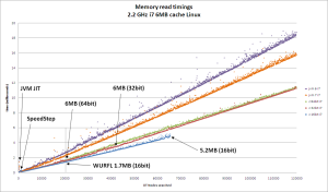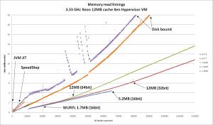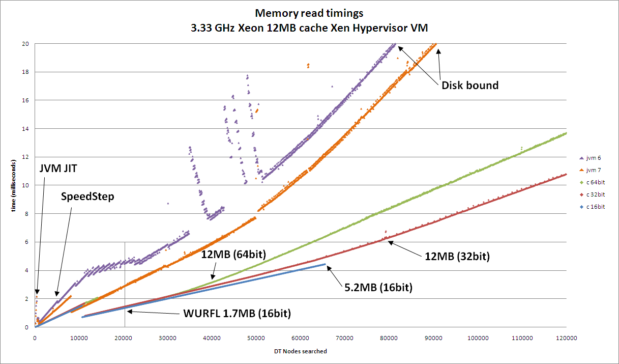 Some interesting performance metrics can be seen on the corresponding graphs. On the first graph, you can clearly see the costs (or benefits) associated with hitting CPU cache, system memory, and virtual memory. On the second graph, we see a totally different set of performance metrics. On this system, main memory reads are almost indistinguishable from CPU cache reads. Also, Java performance on this system is more in line with C performance. Overall, it is clear that performance is highly dependent on memory performance. On both systems, this implementation can easily achieve millions of real time classifications a second per core. This highlights an important point, careful attention to and understanding of language, algorithms, memory, and system tuning are instrumental in achieving high levels of performance from your software.
